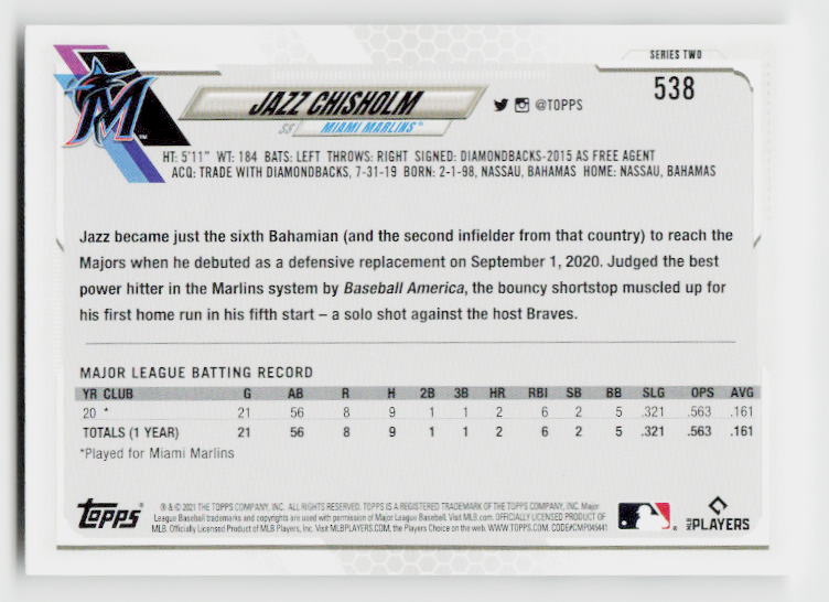 2021 Topps #538b Jazz Chisholm Wearing "Respect Miami" t-shirt